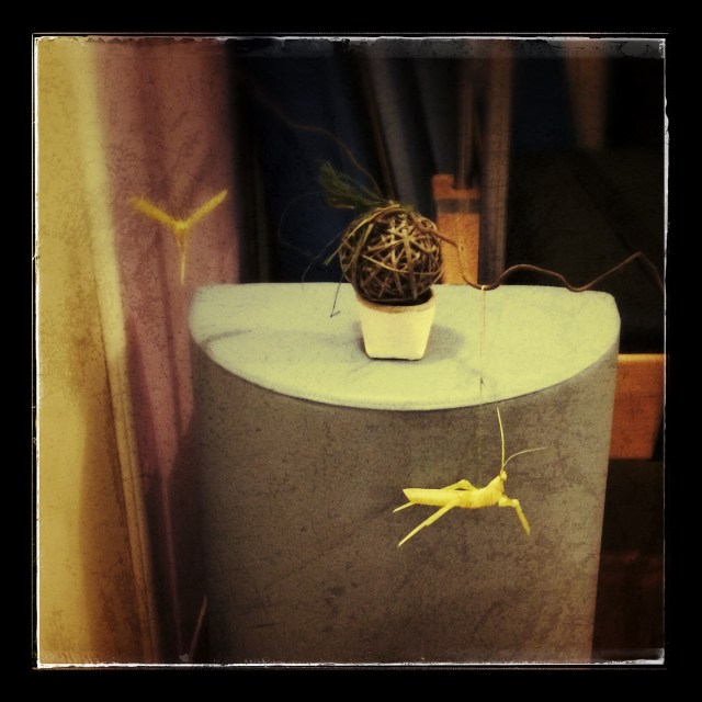 metti queste tre cose insieme e ti ritrovi a girare per strada con un palla da cui escono due rami a cui sono appesi una libellula e una locusta e la gente ti guarda e sorride…